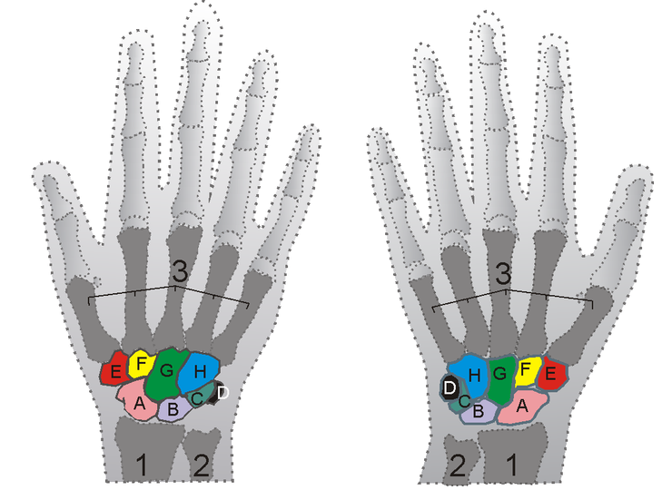 ヒトの有鈎骨は、左右の手に1本ずつ存在し大菱形骨、小菱形骨、有頭骨とともに遠位手根骨を構成している。